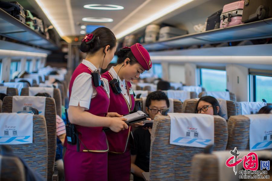 赵小琴带着自己的徒弟进行查票、补票的工作。工作经验丰富的赵小琴平时除了完成自己列车长的工作之外,还会帮助一些新车长成长,老铁路人那股“传、帮、带”的精神在她身上很好的体现着,跟着她学习的新车长都是一岗双责,需要服务的时候当乘务员,不需要服务的时候就跟着赵小琴学习管理方面的知识,例如站车交界,站车协同和处理突发情况等。中国网 郑亮摄