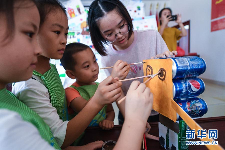 当日,浙江省长兴县林城镇为当地乡村的孩子们开设主题为“环保第一课,发现家乡美”的暑期课堂。杭州师范大学的大学生志愿者和乡镇工作人员一起为孩子们讲解垃圾分类知识,带领他们用废旧物品制作环保装饰品,通过绘画的方式展现家乡最美的一面。新华社记者徐昱摄