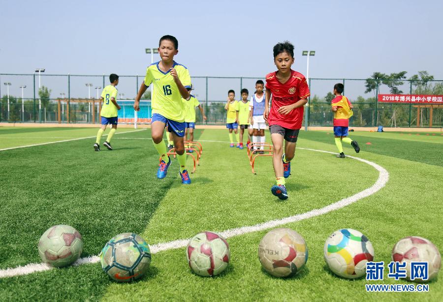 7月22日,在山东省滨州市博兴县,参加足球夏令营的小学生在进行足球训练。