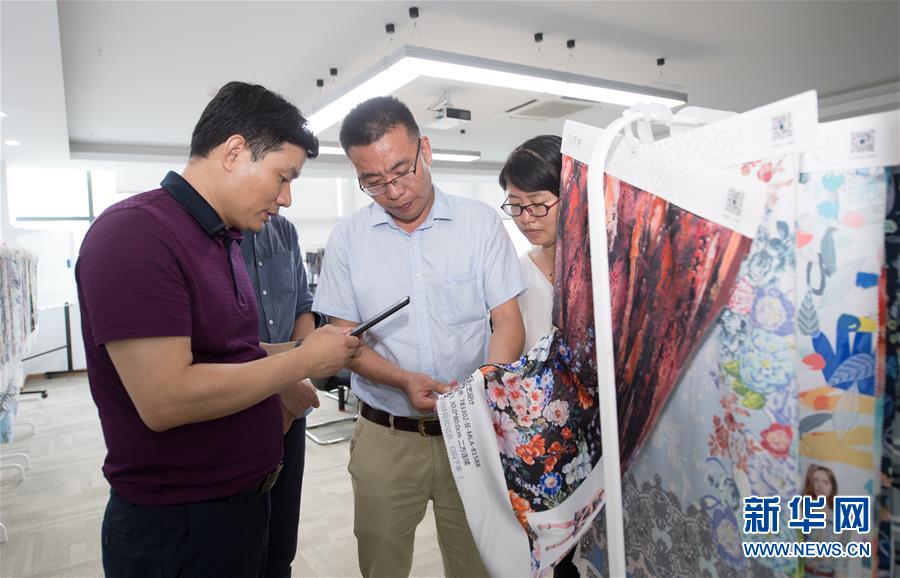 7月25日,工作人员(左一)通过扫描二维码展示如何查看花型版权和交易信息。近年来,位于浙江省绍兴市柯桥区的中国轻纺城为提升从创意设计到工业制造产业链的应用效率,大力扶持纺织印染行业的智慧转型。“瓦栏”网上印花设计数据库于2012年上线,目前已集聚了全球5000余名设计师,每年发布近10万种花型,改变了传统印染业设计力量匮乏的状况,成为中国轻纺城转型升级的一个亮点。目前,“瓦栏”已有10万多个花型获得版权登记,500多个企业成为花型版权会员,有效推动纺织印染行业花型版权保护意识的提升。新华社记者 翁忻旸 摄
