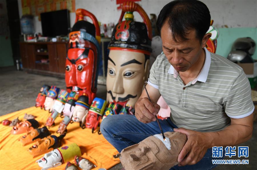 7月25日,方文展在为一个毛南族傩面上涂料。广西环江毛南族自治县洛阳镇江口村大河屯农民方文展是家族第四代毛南族傩面雕刻传人,也是自治区级非物质文化遗产代表性项目——毛南族木雕技艺的代表性传承人。毛南族傩面需要用优质木料雕琢,分文、武、善、凶4大类36套72种面相,性格神态各有特点。雕刻者要在毛南族民间口头文学的基础上依据个人想象创作,一张傩面需要10多道工序花费近一周时间才能完成。新华社记者 陆波岸 摄
