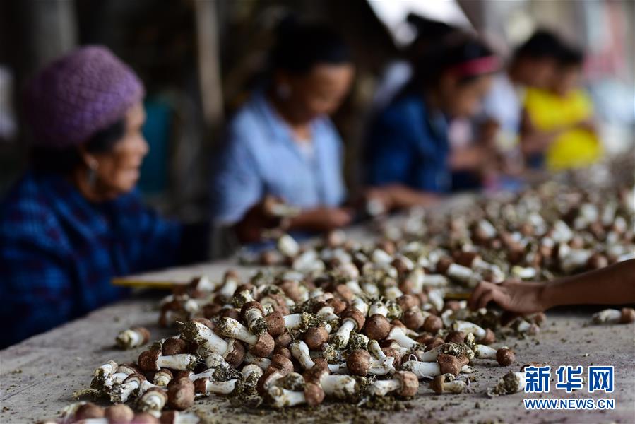 7月25日,贵州省丹寨县排调镇也改村村民在清理刚刚采摘的姬松茸。 盛夏时节,贵州省黔东南苗族侗族自治州丹寨县排调镇也改村种植的大棚姬松茸迎来采收季,大棚内外一派繁忙景象。 在当地政府和帮扶单位的帮助下,也改村从2017年开始种植具有食用和药用价值的姬松茸,有效带动了种植户脱贫致富。 新华社发(杨武魁 摄)