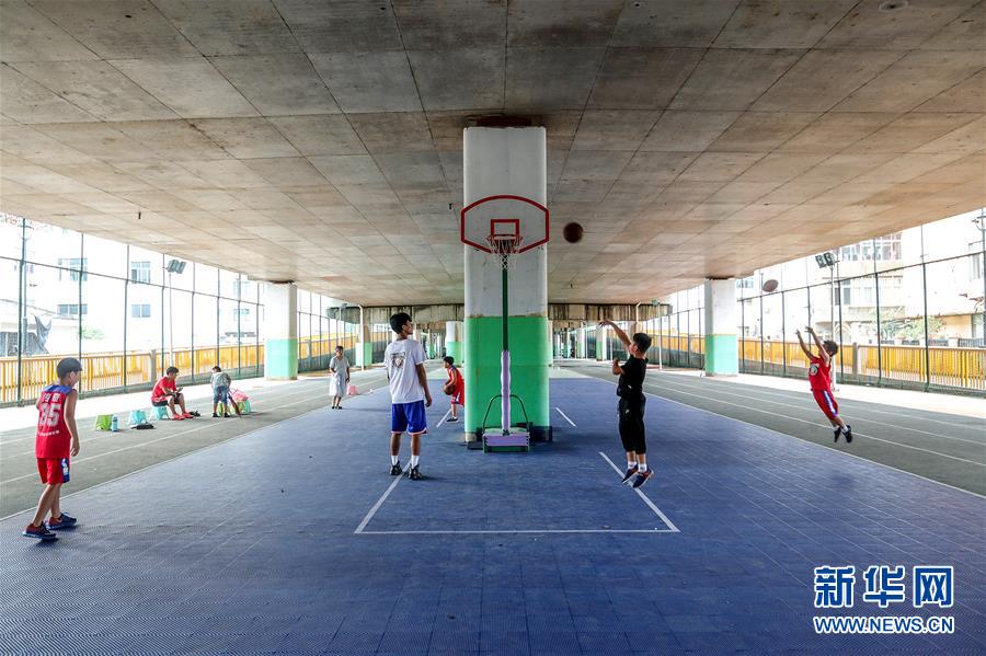 7月26日,人们在“桥下驿站”篮球场练习投篮。