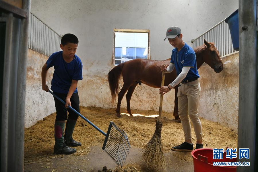 在江西省抚州市宜黄县阳光马术学校,学员黄万鹏(右)带领小学员一起打扫马房(7月25日摄)。新华社记者 周密 摄