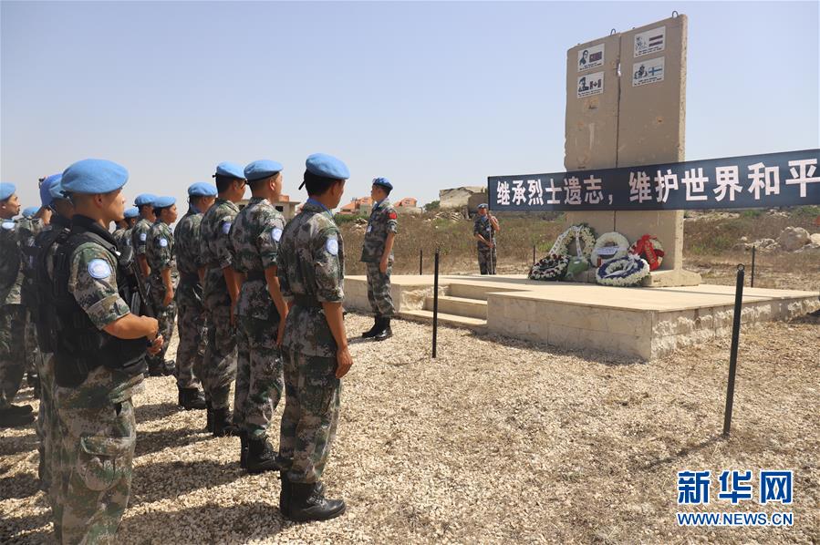 7月25日,在黎巴嫩南部靠近以色列边境的希亚姆镇,中国赴黎维和部队官兵代表在纪念碑前悼念烈士。