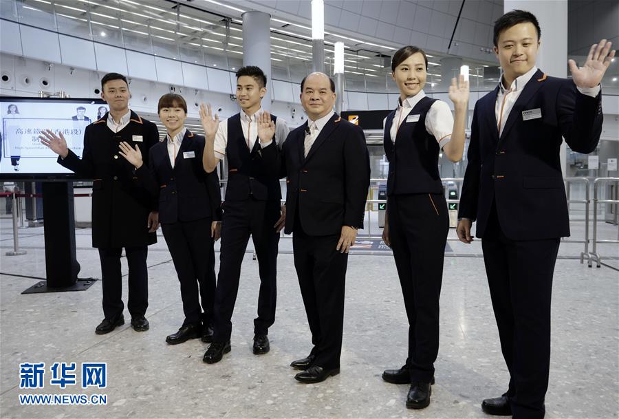 7月26日,在香港西九龙火车站,港铁公司在简介会现场展示专为高铁服务团队设计的制服。新华社发(王申 摄)