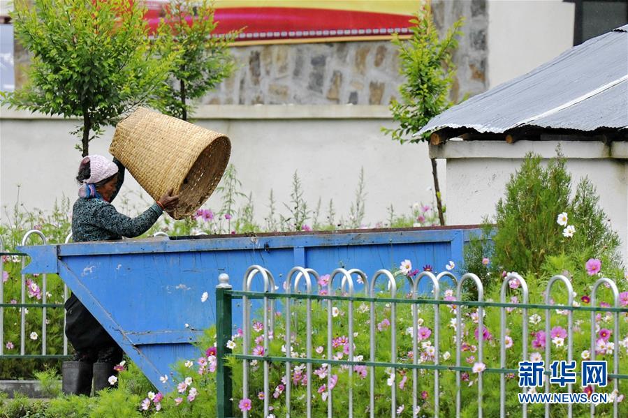 在吉隆县吉隆镇玛嘎村,一名村民将垃圾倒入收集箱(7月26日摄)。 新华社记者张汝锋摄