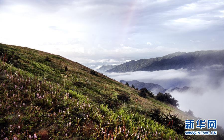7月27日,一道彩虹在正阳草甸上升起。 陕西省平利县正阳镇的大巴山脉上,有一处郁郁葱葱的高山草甸。盛夏时节,这里绿草如茵,野花遍地,一片清凉世界,成为夏日游人消暑休闲的好去处。新华社发 李涛 摄