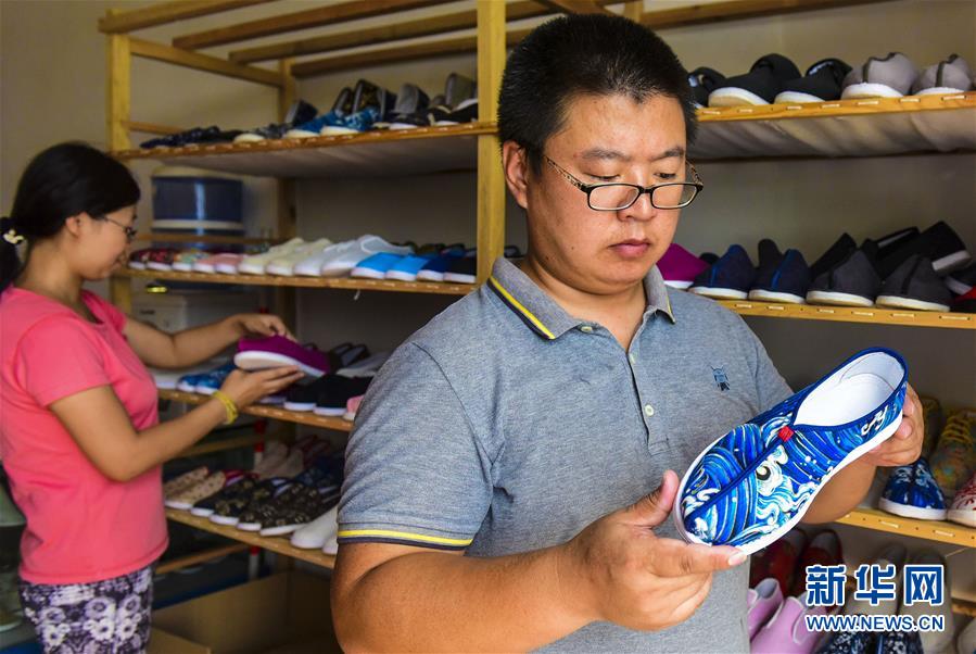 7月27日,朱冰夫妇在检查布鞋成品质量。 今年32岁的朱冰毕业于重庆工程职业技术学院,2014年,他和毕业于东北林业大学的妻子温继伟回到家乡河北省阜城县大白乡许庄村,从事手工千层底布鞋的制作,开始了创业之路,并借助电商平台进行网上销售。他们制作的手工千层底布鞋由原来单一的普通布鞋,发展到现在的10多个款式、60多种花色,年销售收入100余万元,同时还带动30余名妇女就业。 新华社记者 李晓果 摄