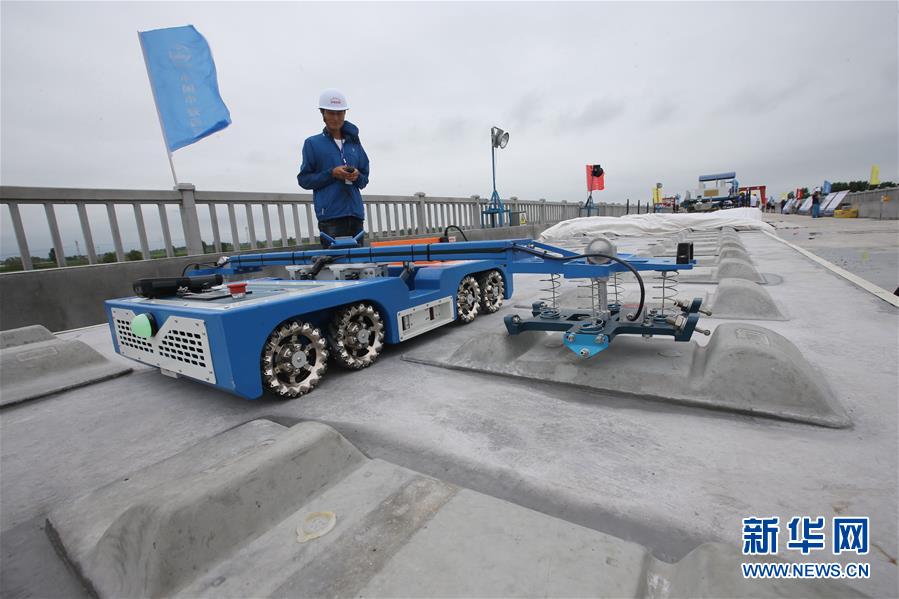 7月27日,在位于湖北省襄阳市襄州区境内的郑万高铁湖北段朱集特大桥建设工地,技术人员使用机器人对高铁无砟轨道承轨台进行检测。 当日,在郑万高铁湖北段朱集特大桥建设工地,由中铁四局研发的无砟轨道成套自动化设备投入使用。这套设备通过无线通信模块接收分析数据并进行自动调整,确保了无砟轨道的建设精度,实现智能化、自动化施工。 新华社发(王虎 摄)