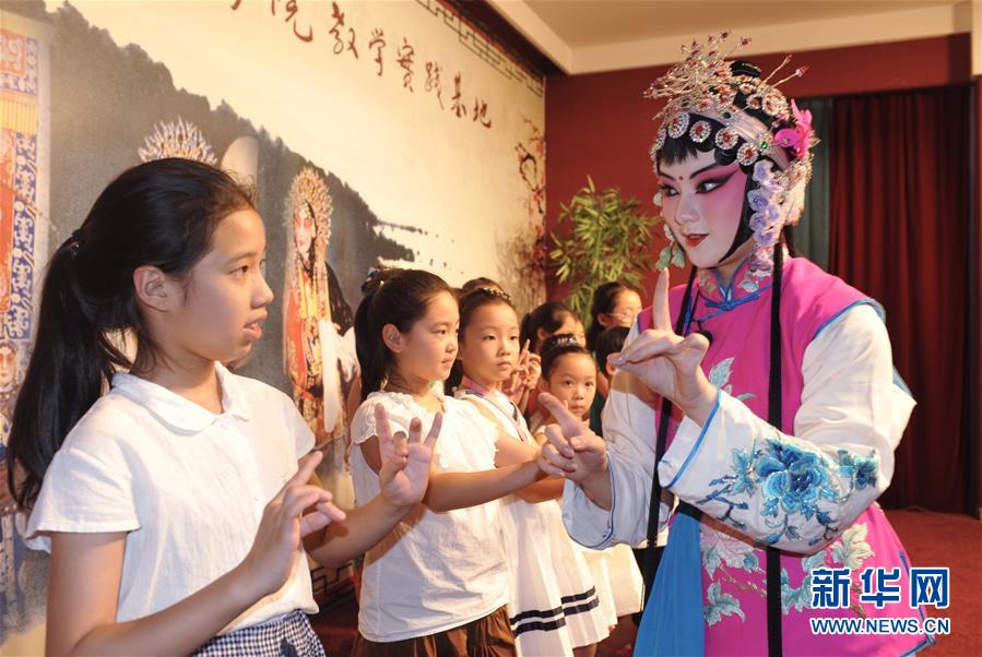 7月27日,在江苏泰州梅兰芳纪念馆,中国戏曲学院大一学生邓沛昀向小朋友示范京剧手势。 暑假期间,中国戏曲学院的学生们来到位于江苏泰州的梅兰芳纪念馆中国戏曲学院教学实践基地,义务向前来参观的孩子们介绍京剧的身段、念白等知识,培养孩子们对中国传统戏曲艺术的兴趣。 新华社发(刘玉和 摄)