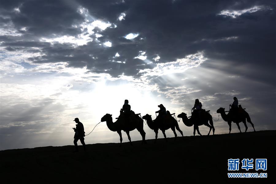 7月29日,游客在甘肃省敦煌市鸣沙山月牙泉景区参观游览。 当日,甘肃省敦煌市鸣沙山月牙泉景区云景如画,美不胜收,游客徜徉其中,尽情欣赏大漠风光。 新华社发(张晓亮 摄)