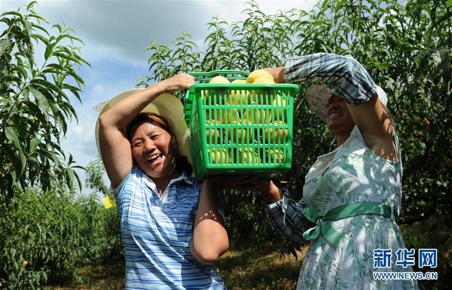 7月29日,果农在贵州省玉屏县朱家场镇前光村黄桃基地搬运采摘的黄桃。