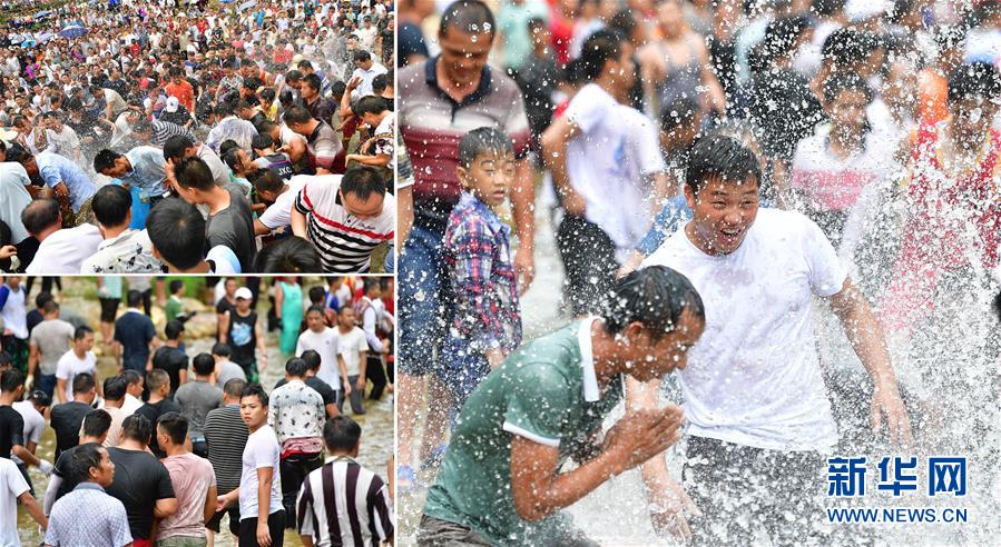 拼版照片:右图为在广西融水苗族自治县红水乡良双村,驻村第一书记廖首(身着白衣者)在闹鱼节上和群众一起抓鱼(7月28日摄);左上图为闹鱼节热闹的场景(7月28日摄);左下图为廖首(身着白衣者)在人群中不时观察现场情况(7月28日摄)。7月28日是良双村传统的闹鱼节,数千群众聚在一起,廖首的组织工作压力巨大,在烈日下奔走的他衣服早就湿透。良双村目前还有600多户贫困户,脱贫任务艰巨。廖首今年3月份到任,他将带领群众修建基础设施,发展产业,尽快实现脱贫。 广西融水苗族自治县是国家扶贫工作重点县,全县“九山半水半分田”,生存环境较为恶劣,脱贫攻坚任务艰巨,目前还有7.68万贫困人口。面对经济发展落后、贫困面广且程度深的现状,当地的大批扶贫干部、企业人员、施工队、脱贫致富带头人等,克服重重困难,搞建设、兴产业、改造危房、发展教育,他们在苗山深处,和广大群众一道,团结一心,挥洒着辛勤的汗水,拔穷根摘穷帽。 新华社记者黄孝邦摄
