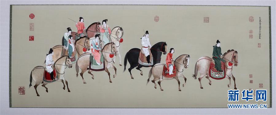 这幅苏绣作品《虢国夫人游春图》耗费了数位绣工7年的时间绣制完工(7月29日摄)。 新华社记者杨磊 摄