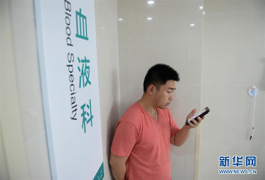 在苏州永鼎医院医生查房等候时间,郑勇涛用手机看网上募捐情况(7月21日摄)。 新华社记者季春鹏摄