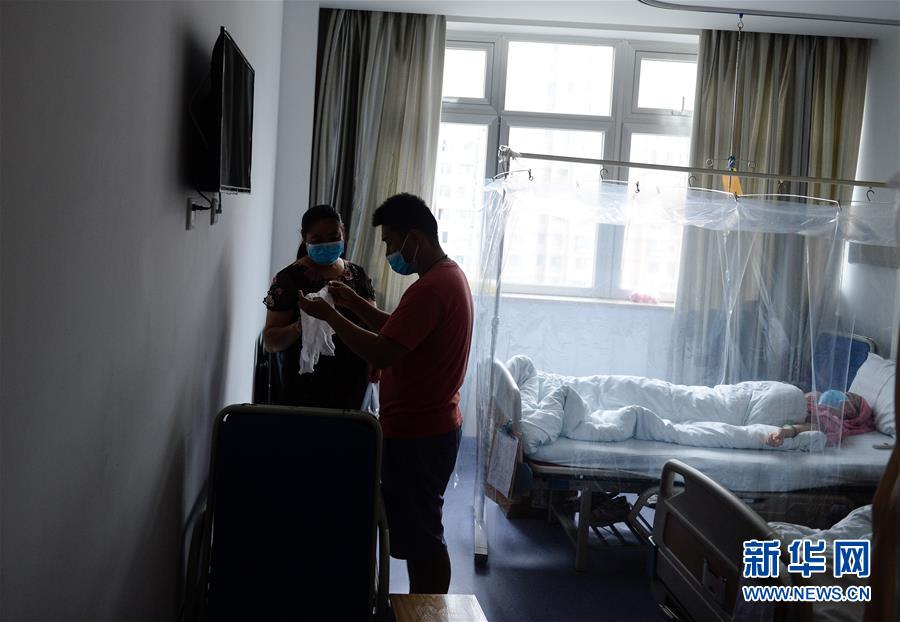 在苏州永鼎医院,郑勇涛(左二)在准备工具给龚雪娟做她爱吃的蒸面(7月21日摄)。为了保证龚雪娟的营养,郑勇涛每天都去菜场买新鲜的食材,学着做龚雪娟爱吃的饭菜。 新华社记者季春鹏摄
