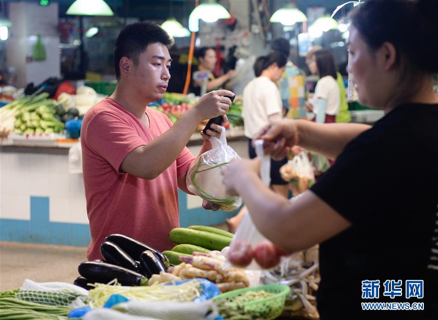 郑勇涛(左)在苏州永鼎医院附近的菜场买菜,准备给龚雪娟做午饭(7月21日摄)。为了保证龚雪娟的营养,郑勇涛每天都去菜场买新鲜的食材,学着做龚雪娟爱吃的饭菜。 新华社记者季春鹏摄