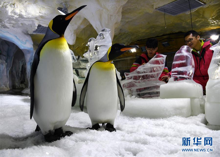 7月30日,工作人员在青岛海昌极地海洋公园企鹅馆内维护冰雕。 新华社记者 李紫恒 摄