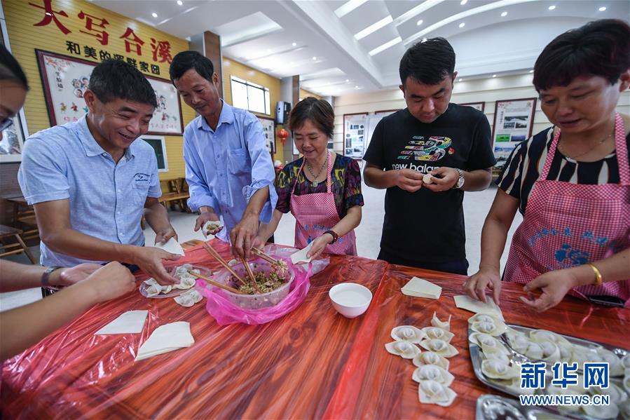 7月30日,在长兴县小浦镇合溪村文化礼堂,村民们和退伍军人一起包馄饨。
