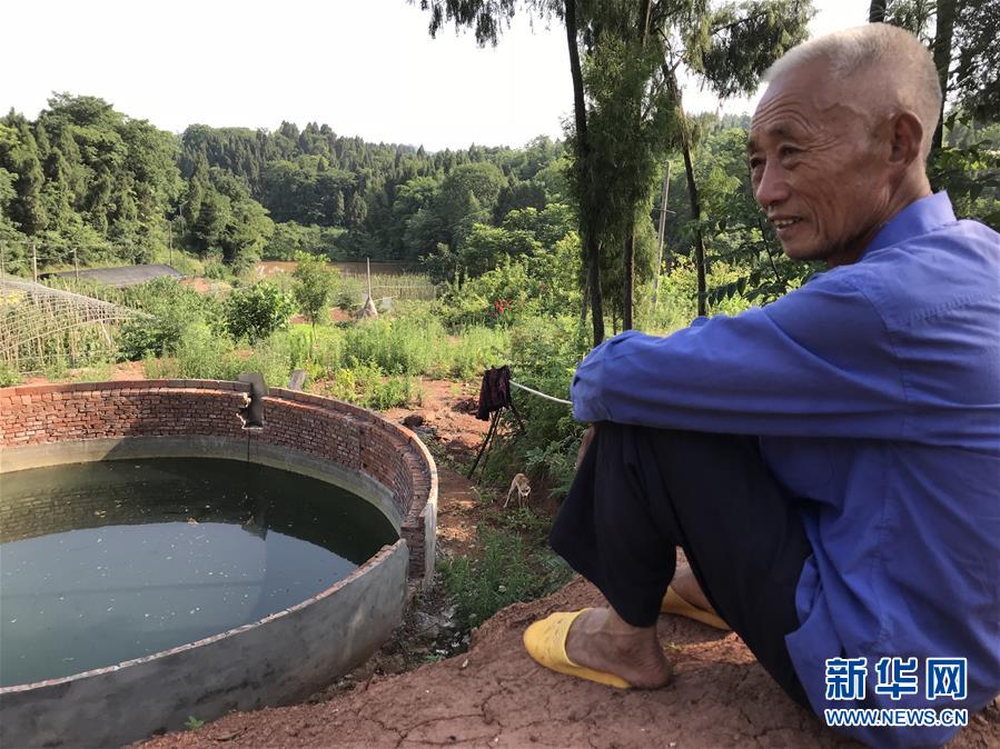 劳作了一天的吴恒忠在重庆市潼南区花岩镇龙怀村自家门口的蓄水池旁休息(6月6日摄)。