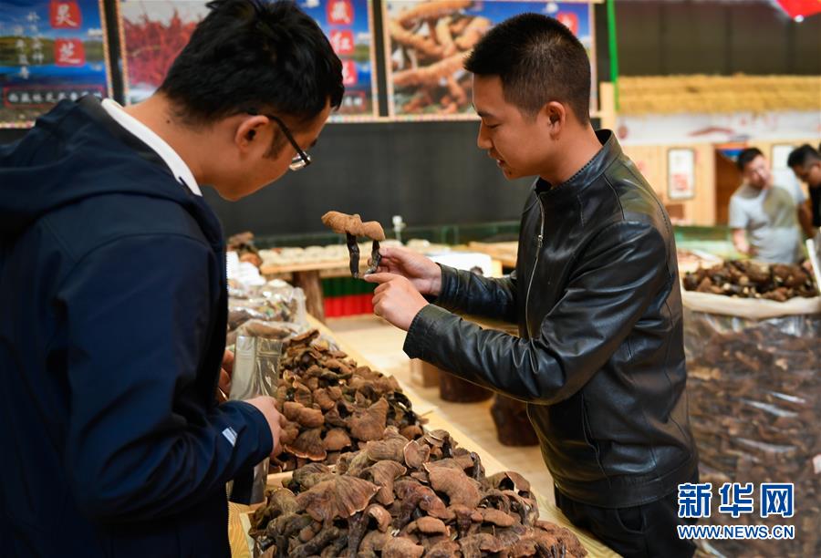 顾客(左)在西藏林芝市米林县南伊村白灵芝种植基地了解白灵芝产品(7月27日摄)。新华社记者 刘东君 摄