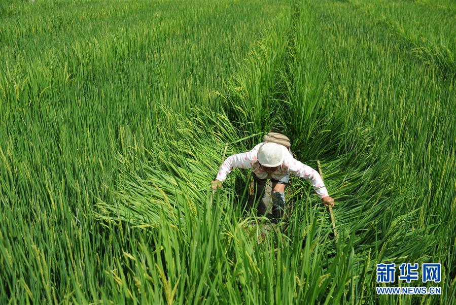 7月30日,农户在贵州省岑巩县思旸镇国家级杂交水稻制种基地对杂交水稻进行人工授粉。 新华社发(杨文斌 摄)