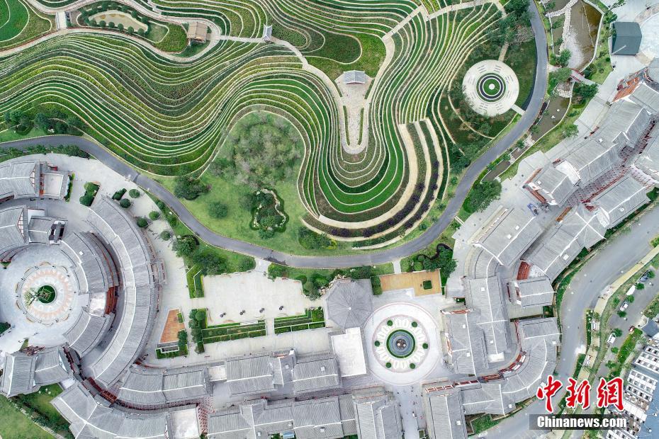 7月30日,俯瞰位于贵州省大方县奢香古镇的古彝梯田美景,相连的梯田线条宛如大地指纹。贵州大方奢香古镇是大方县易地扶贫搬迁安置区,规划建设时,在古镇中心建设了12万平方米的“城市梯田”,种植玫瑰花等观赏类植物,发展农旅结合的乡村观光旅游。盛夏时节,俯瞰层次分明的城镇中梯田,美不胜收。中新社记者 贺俊怡 摄