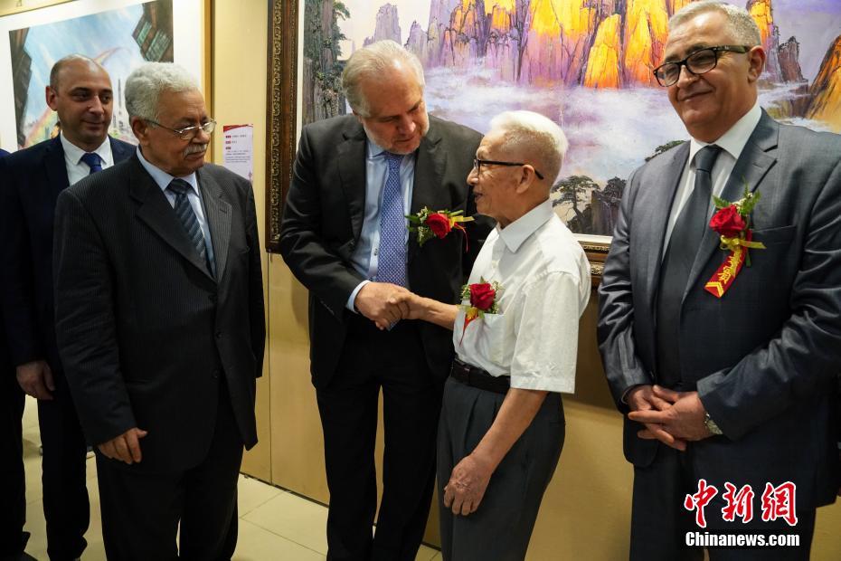 7月30日,纪念改革开放四十周年·中国美术作品主题创作展暨国际文化交流活动开幕式在北京公共外交文化交流中心举行。巴勒斯坦、摩洛哥、尼泊尔、斯里兰卡、亚美尼亚、智利等20多个国家的驻华使节出席活动并参观主题美术展。据悉,活动由公共外交文化交流中心、中国文化信息协会文化艺术人才促进工作委员会主办。展览共展出作品40幅,旨在向驻华使节及国际友人反映中国改革开放四十年来社会经济发生的变化与成绩。图为智利驻华使馆临时代办龚谷泰(右三)与中国艺术家代表朱曜奎(右二)在其画作前握手合影。中新社记者 崔楠 摄