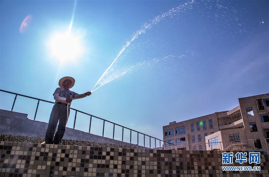 7月30日,在江西省九江市一处建筑工地,一名工人在施工现场浇水。 烈日炎炎,热浪袭人。建筑工地的劳动者不畏酷暑,坚守岗位,为城市的建设奉献汗水。 新华社发(杨牧青 摄)