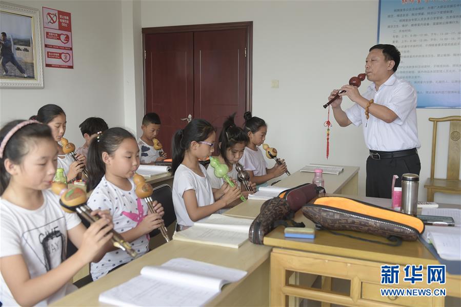 7月31日,一名指导老师(右一)在指导孩子们学习吹奏葫芦丝。 新华社记者 鲁鹏 摄