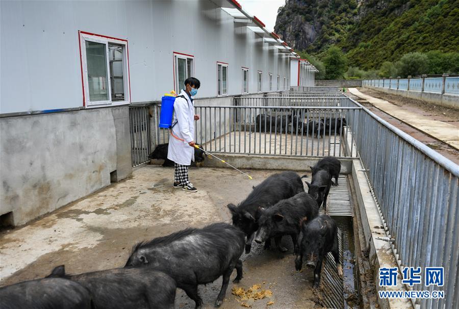 西藏林芝市工布江达县朱拉乡柳四朗村藏猪扩繁基地的工作人员桑旦顿珠在给猪圈喷雾消毒(7月29日摄)。