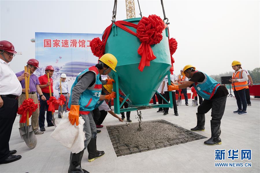 这是在北京冬奥会国家速滑馆施工现场,工人浇筑地下结构最后一块顶板混凝土(2018年6月26日摄)。 新华社记者鞠焕宗摄