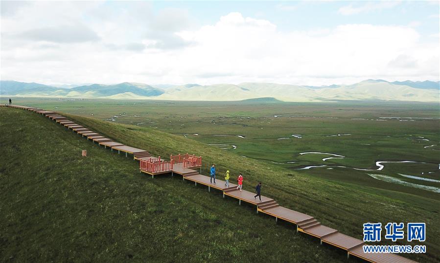 游客在玛曲县阿万仓湿地的观景步道上游览(7月31日无人机拍摄)。 新华社记者 陈斌 摄