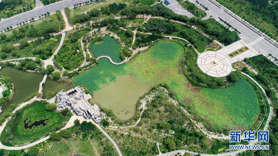 在宁夏石嘴山大武口发电厂第二排灰场上建起的石嘴山人民公园(7月31日无人机拍摄)。 新华社记者 王鹏 摄