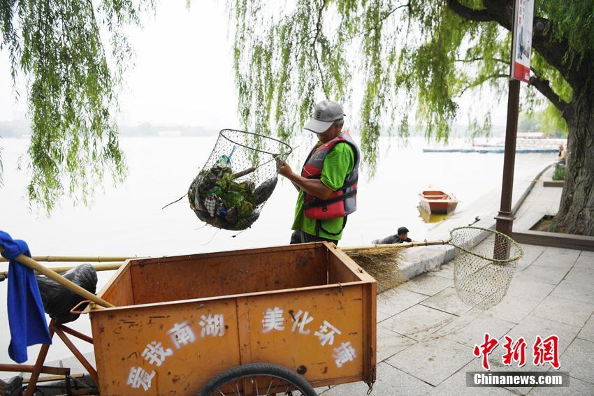 孙方杰将清理完的垃圾送往岸边的垃圾车。 张瑶 摄