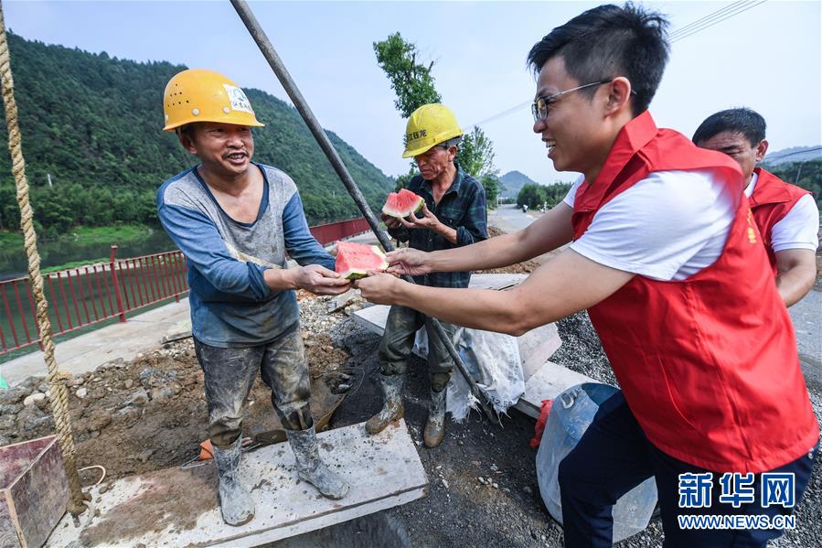 当日,浙江省杭州市临安区潜川镇基层党员服务队来到潜川镇小城镇环境综合整治工地,为这里的建设者送去西瓜、凉茶、防暑药品等消暑物资,让他们感受到夏日里的清凉。 新华社记者 徐昱 摄