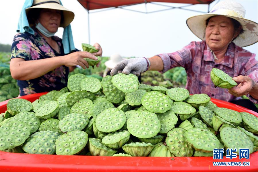 盛夏时节,山东省临沂市郯城县马头镇采莲湖的“复耕莲蓬”丰收上市,吸引临近客商前来采购。采莲湖所在地曾为砖厂,经开垦复耕后用于莲蓬种植和鱼类养殖。 新华社发(房德华 摄)