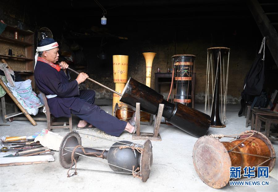 8月1日,在广西金秀瑶族自治县六巷乡六巷村下古陈屯,村民盘志明在家中制作黄泥鼓。