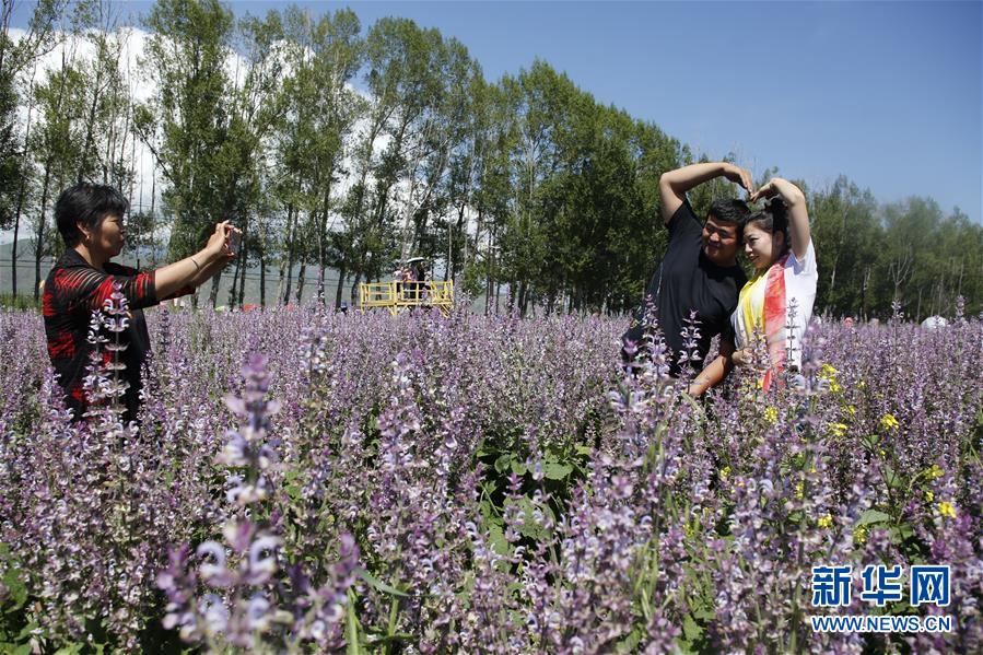 8月1日,来自新疆霍尔果斯的游客在新疆昭苏县一处香紫苏花海景区拍照留影。新华社记者黄臻摄