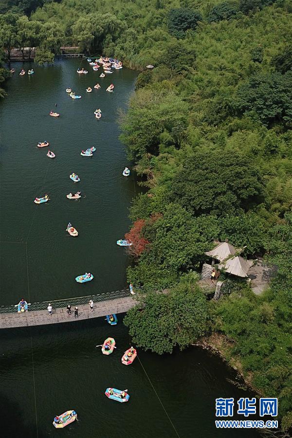 8月1日,游客在江苏省盱眙县天泉湖镇铁山寺森林公园体验峡谷漂流。新华社发(周海军 摄)