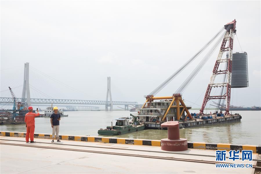 8月1日,在岳阳市城陵矶新港区天欣码头,一艘运输船在吊走一个水泥储罐。随着最后几个储罐被清除,该码头彻底被关停。 新华社记者 金立旺 摄