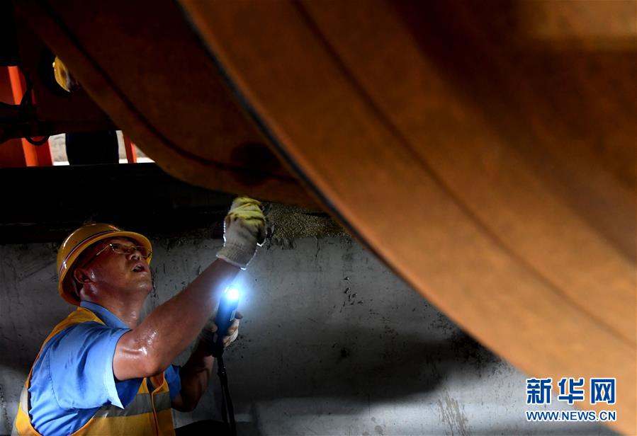 8月2日,郑州机务段客运车间地勤机车队专检员彭红民在检查机车轮轴。