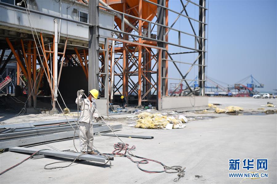 在湖南省岳阳市洞庭湖畔的天欣码头,工人在拆除混凝土搅拌站。过去,这里是一个砂石中转码头和散货集散地,整治后这片地将会复绿(7月11日摄)。