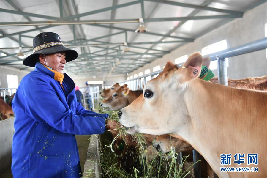 务工人员在噶尔县生态农业产业园奶牛养殖场饲喂奶牛(8月1日摄)。 新华社记者张汝锋摄