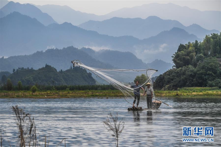 8月1日,淳安县汾口镇红星村的渔民乘着竹排,在千岛湖的支流武强溪上进行撒网捕捞作业。 新华社记者 徐昱 摄