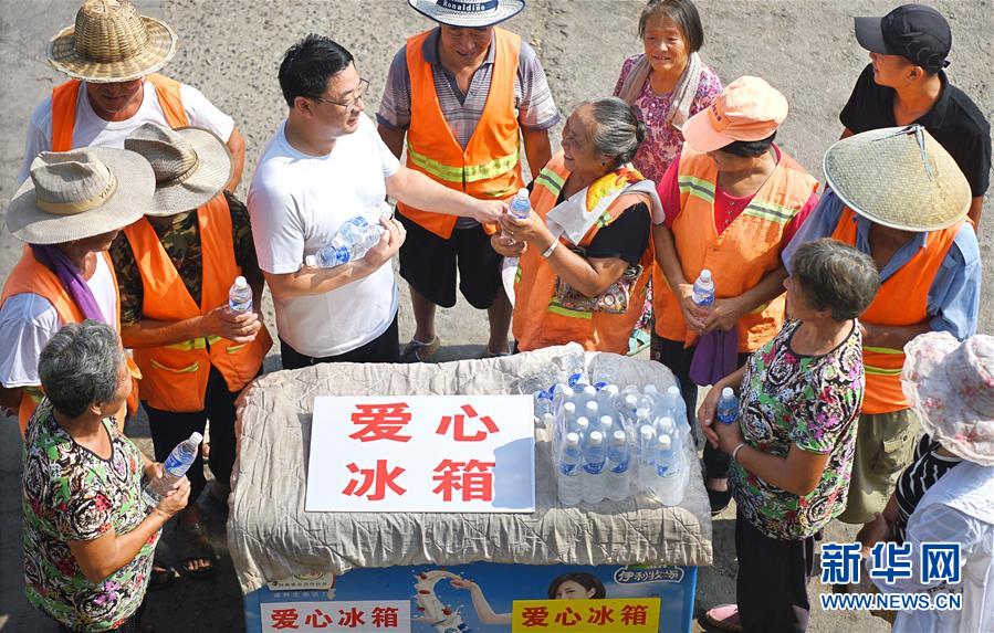 8月2日,在山东省淄博市沂源县东里镇一“爱心冰箱”站点,爱心人士为环卫工人送上饮用水。针对目前的持续高温天气,沂源县积极开放城乡各城管驿站、环卫工人爱心房等场所,为户外劳动者提供喝水休息、纳凉避暑的去处。 新华社发(赵东山 摄)