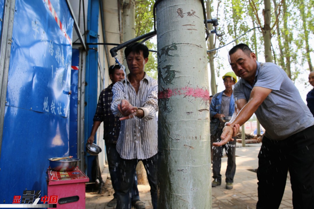 7月30日中午,工人们用凉水洗脸、洗手降温。新华网 杨腾格尔摄
