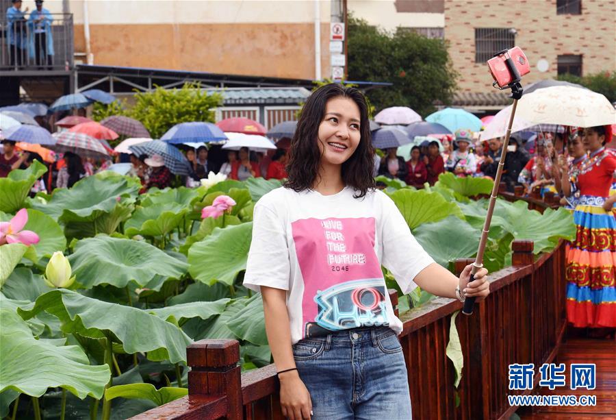 8月3日,游客在姚安县光禄古镇荷塘游览拍照。 当日,以“千年古镇·荷韵光禄·田园姚安”为主题的云南省楚雄彝族自治州姚安县荷花节在光禄古镇拉开帷幕,来自各地的游客在千亩荷塘的秀美田园景色中游览赏荷。 新华社记者杨宗友摄