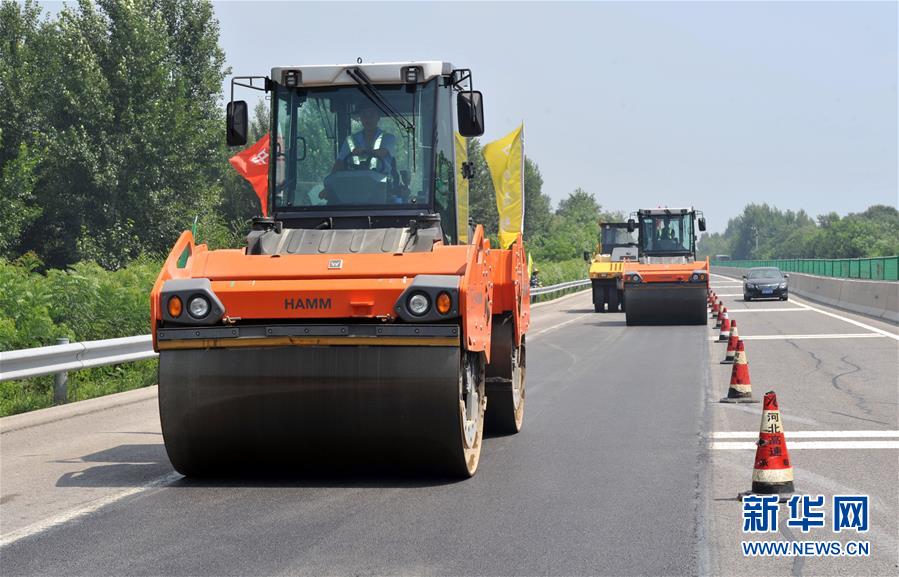 在位于河北省承德市的承朝高速公路项目工地,养护工人操作压路机进行碾压整平作业(8月3日摄)。 新华社记者 赵宇思 摄
